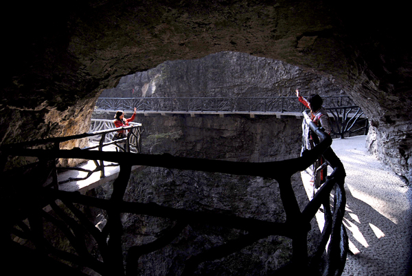 據(jù)施工人員介紹,此條棧道也是他們所修棧道中施工最難,最險(xiǎn)峻的一條.如果您還覺得不夠刺激的話,在棧道的完結(jié)處的兩個(gè)懸崖之間有一條長(zhǎng)160米的懸索吊橋,同時(shí),在海拔最高點(diǎn)還有一個(gè)挑戰(zhàn)心里極限的玻璃站臺(tái),在這里,如果你能挺直腰板伸開雙臂,那么,您就是真正的勇士了.