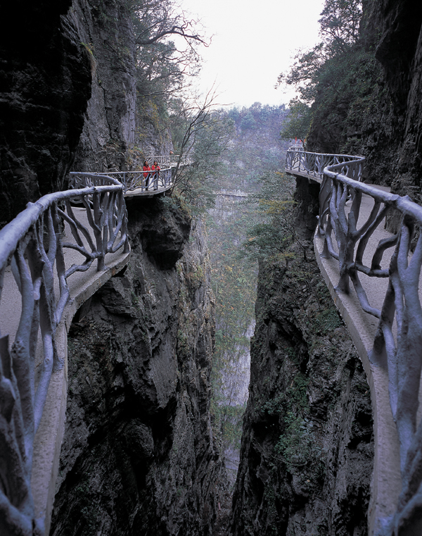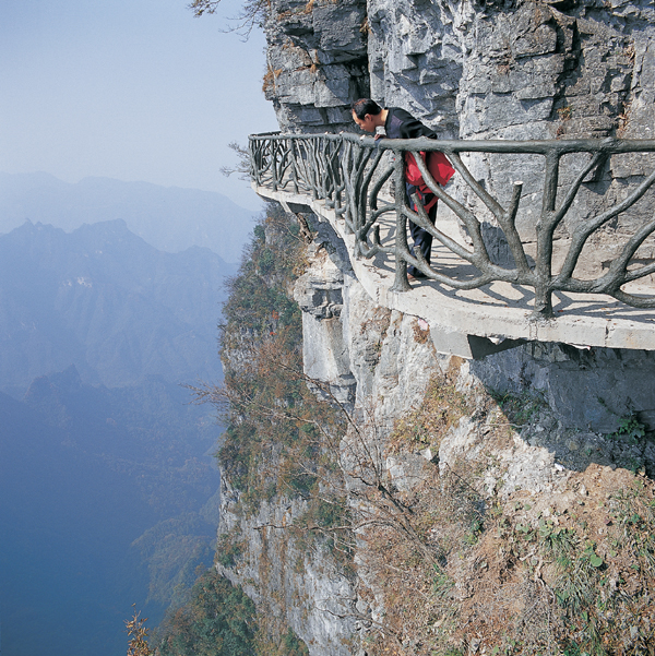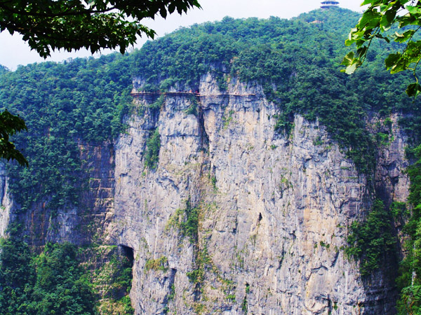站在棧道上俯瞰群山,古人“會(huì)當(dāng)凌絕頂,一覽眾山小”的感覺油然而生.由于天門山是國(guó)家森林公園,植被特別豐富,加上典型的喀斯特地貌,所以,在這條棧道上更能找到一種在乘坐直升飛機(jī)飛越熱帶雨林大峽谷的感覺,這平時(shí)只能在電影里看到的場(chǎng)景,在這里能讓你身臨其境.