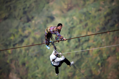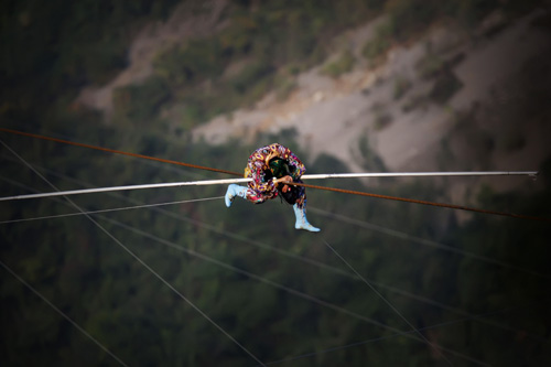 10月18日,新疆達(dá)瓦孜傳人賽買提·艾山在張家界天門山景區(qū)進(jìn)行目前世界最大坡度39°高空鋼絲的極限挑戰(zhàn)的途中發(fā)生意外,在距離終點約50米處跌坐在鋼繩上,最終被迫放棄挑戰(zhàn)。具精確統(tǒng)計,本次挑戰(zhàn),賽買提·艾山行走的長度為650米,鋼繩坡度為39°,所用時間為49分鐘,雖然沒有到達(dá)原計劃的700米終點,但是他也已成功挑戰(zhàn)了目前世界最大的高空鋼絲坡度39°。意外發(fā)生后,天門山景區(qū)預(yù)先安排的安全人員立即展開救援,歷時1個多小時將賽買提-艾山順利從鋼繩上救下。