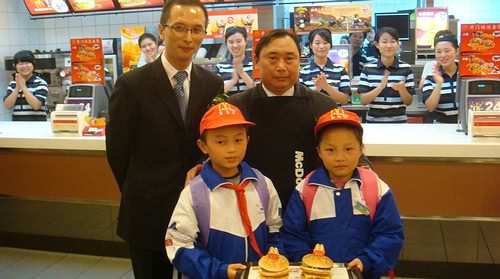 張家界市人大副主任王海生(后排右一)在麥當勞湖南、武漢、浙江市場營運總監(jiān)李輝的陪同下,親自制作了張家界解放路麥當勞餐廳的第一個巨無霸漢堡,并贈送給當?shù)丶彝ヘ毨У暮⒆觽儭?/P>