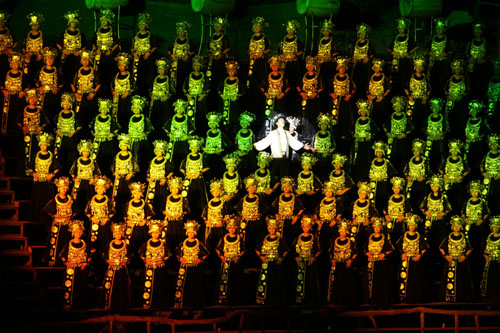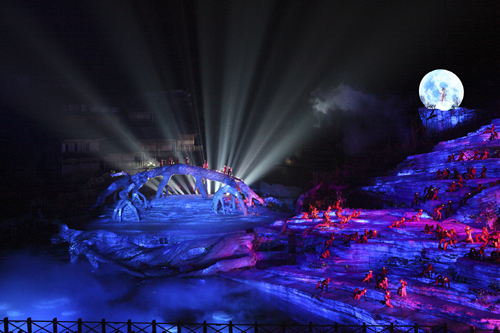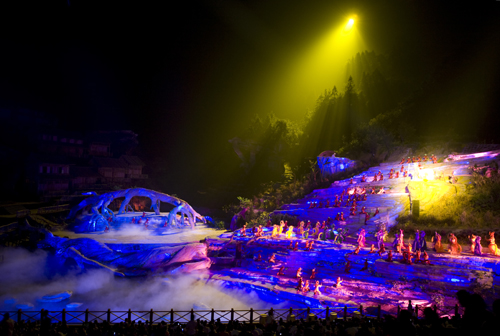 世界第一臺大型山水實景音樂劇《新劉?抽浴吩趶埣医缣扉T山試演。9月13日晚,參加2009湖南國際旅游節(jié)的國內(nèi)外嘉賓、領導和媒體記者近3000人共同見證這一輝煌時刻。