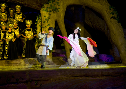 《新劉?抽浴肥鞘澜缟系谝慌_以高山奇峰為舞臺背景,以山澗峽谷為表演舞臺的山水實景演出;也是目前世界第一臺有完整故事情節(jié)的山水實景音樂歌舞劇。大型山水實景音樂劇取材于中國經(jīng)典的神話傳說和民間故事,汲取世界豐富的音樂文化元素和表現(xiàn)形式,輔之以現(xiàn)代高科技的舞臺特效技術,是對世界音樂歌舞劇的一次成功的創(chuàng)新,成為中國山水實景演出的劃時代巨獻。