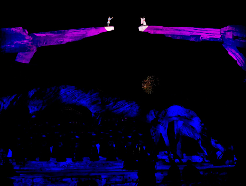 本項目觀眾劇場及主舞臺總占地面積19880平方米,其中全景舞臺10000平方米,采用玻璃鋼設計,通過燈光效果可通體透亮,營造出奇幻場景。整個表演區(qū)包括:中心舞臺、左側(cè)的人間世界,右側(cè)的狐貍世界、左前歌隊歌臺、后演區(qū)梯田與木橋?qū)嵕肮参鍌演區(qū)。