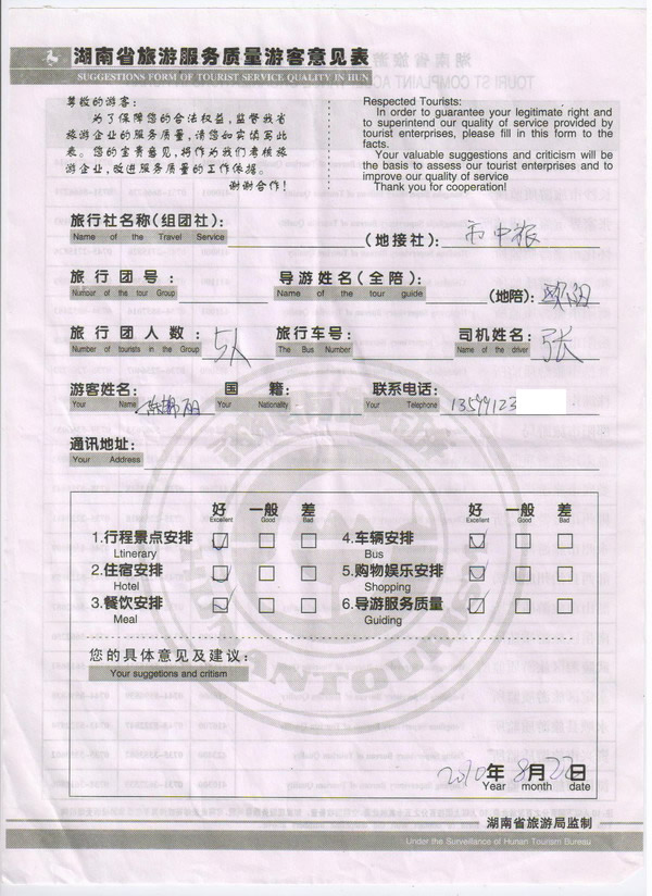 泉州陳錦麗一行5人旅游質(zhì)量回饋