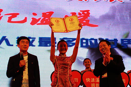 當(dāng)晚,張家界溪布街彩燈妖冶,人流如織,不同膚色,不同服飾的男女老少,游客商賈,儷伉情侶,云集在溪布街,盡情享受“白果樹下愛情夜”。他們或乘坐彩船,在索溪河蕩漾一腔幽情;或呼朋引伴,在主會場表演搶親鬧;或登臨閨樓,窺覓著精致漂亮的繡球;更有楞頭小伙,干脆擁擠在各十字街口,等待那將創(chuàng)世界紀(jì)錄少女們的世紀(jì)相擁……溪布街,正描繪著休閑、激情、浪漫、唯美的幅幅畫面。
