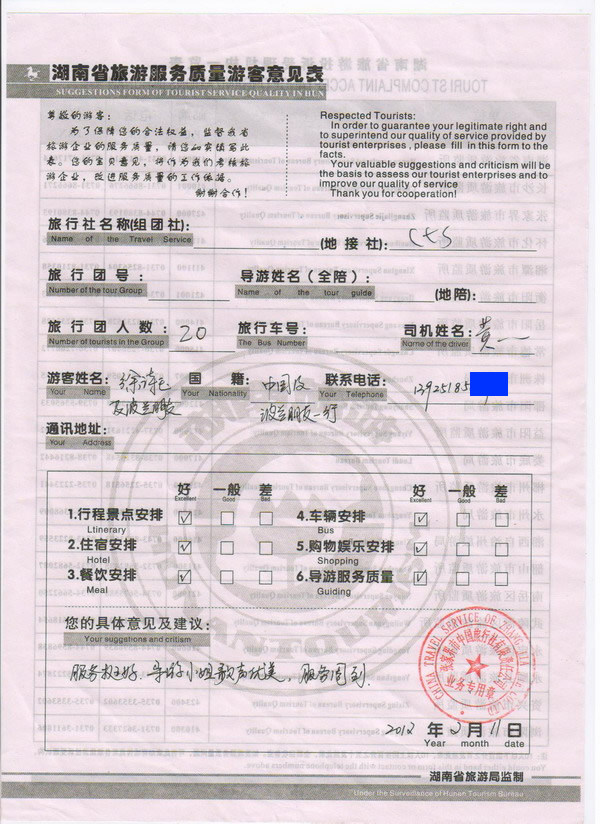 廣州徐小姐一行20人旅游質(zhì)量回饋