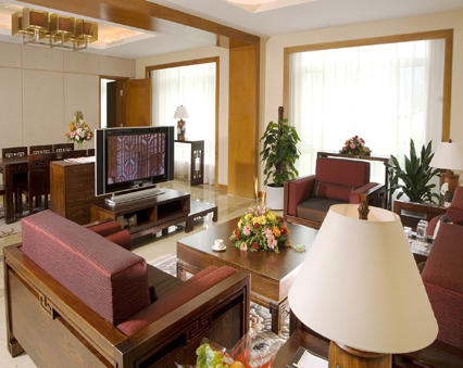 大使套房:面積153平方米,由一個(gè)客廳、一書房和兩個(gè)臥室組成,所有房間都可看到百丈峽風(fēng)光。
