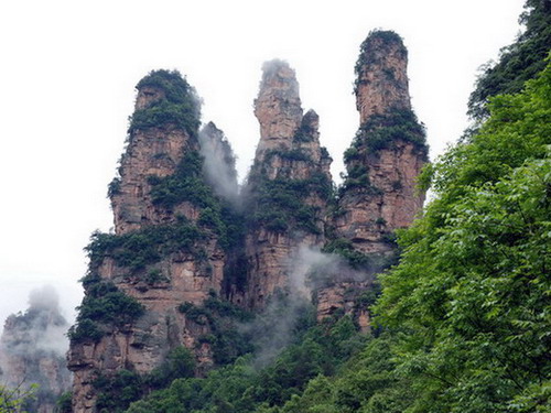聳立著的三座灰白色的石峰,人稱“三姐妹峰”。每座峰高100多米,上小下大,形似三個穿著花羅裙的苗族少女。她們立在山梁上,亭亭玉立,若有所思,真是神形兼?zhèn)洹O鄠鬟@是三個苗姑站在山梁上與情郎對唱情歌,她們情真意切,在這里唱了三天三夜的苗歌。后來天上出現(xiàn)七個日頭,把大地曬裂口了,把樹木曬枯了,把河水曬干了,把她們?nèi)齻人哩,燒化為石頭了。