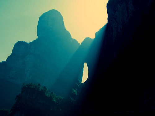 順勢(shì)而上,可見(jiàn)幾座遠(yuǎn)峰迎面而來(lái),外形如根根箭桿,共有九座相連,傳說(shuō)是后羿射日的九根箭桿所化而成.美麗的傳說(shuō)和神奇的景觀,融匯成了天門山的雄偉,奇俊和妖嬈,充盈著整條通天大道的旅程,最終讓人感受到的則是天門山的慧然靈氣!