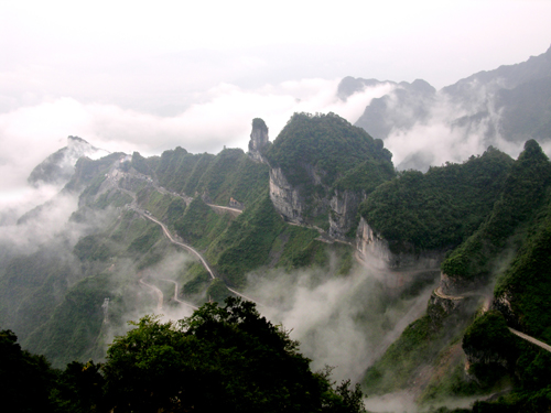 通天大道以進(jìn)山時(shí)的標(biāo)志門為起點(diǎn),一直通達(dá)天門洞腳下,全長(zhǎng) 10.77 公里 ,但就在這么短的距離里,它的海拔卻從 200 米 急劇提升到了 1300 米 ,大道兩側(cè)絕壁千仞,空谷幽深, 180 度的急彎此消而彼長(zhǎng),層層疊起,“ 堪稱天下第一公路奇觀 ”.中國(guó)書法協(xié)會(huì)常務(wù)副會(huì)長(zhǎng)沈鵬先生走過(guò)通天大道后欣然為其題字“曲道通天”,字體遒勁挺拔,與通天大道的奇絕天下相融為一體.