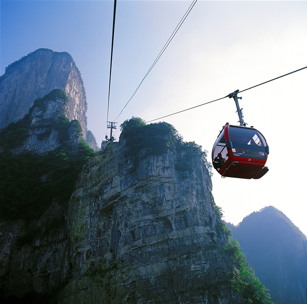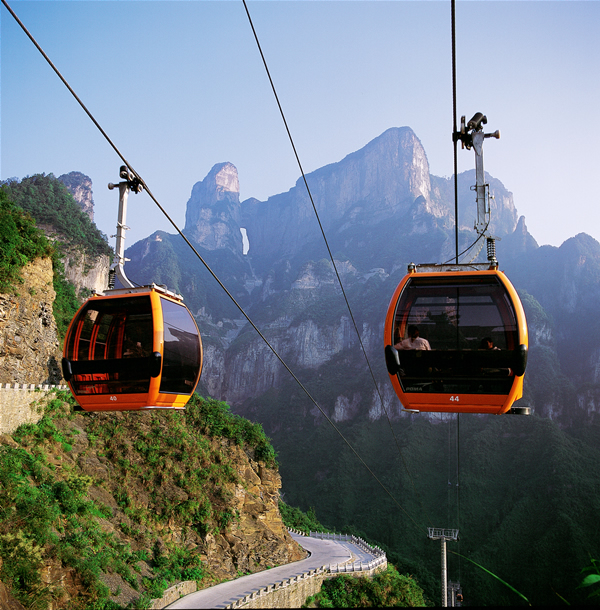 天門山索道線路斜長(zhǎng) 7455 米 ,它以張家界市中心的城市花園為起點(diǎn),直達(dá)天門山頂?shù)脑伎罩谢▓@,猶如一道彩虹飛渡“人間” “ 天上 ” ,又象一條巨龍騰翔 素云蒼穹,依山籍壁,拔地沖天,恢宏壯觀。 天門山索道自 2003 年元月 15 日開(kāi)工至 2004 年底竣工,總投資 2.26 億元人民幣。由于索道沿線山體高絕奇險(xiǎn),地質(zhì)地貌復(fù)雜多變,設(shè)計(jì)和施工難度遠(yuǎn)遠(yuǎn)超乎一般,整個(gè)建設(shè)過(guò)程艱辛無(wú)比。天門山索道不僅凝結(jié)了中外參建人員的智慧和汗水,也融合了當(dāng)代索道工程最先進(jìn)的科技成果,堪稱當(dāng)代索道工程建設(shè)中的一個(gè)奇跡,一個(gè)里程碑。 天門山索道綜合了世界上最尖端的客運(yùn)索道技術(shù),索道共有 57 個(gè)支架,其中含 3 個(gè)水平救護(hù)支架,支架由國(guó)內(nèi)生產(chǎn),主要設(shè)備均由法國(guó)波瑪公司供應(yīng),索道鋼繩來(lái)自于法國(guó), 98 個(gè)吊廂來(lái)自瑞士 CWA 公司,單個(gè)造價(jià)高達(dá) 20 萬(wàn)元人民幣。。索道的 運(yùn)載索 張緊系統(tǒng)采用液壓張緊方式,設(shè)一個(gè)中間驅(qū)動(dòng)站,是世界上最長(zhǎng)的單線循環(huán)脫掛抱索器車廂式索道。轎廂體高 2 米 ,單個(gè)造價(jià)高達(dá) 20 萬(wàn)元人民幣。索道鋼繩為 6 × 36WS 型,直徑 50.5 毫米 ,每米重達(dá) 10 公斤 ,索距 6.2 米 ,索道運(yùn)行速度為每秒 6 米 ,按順時(shí)針?lè)较蜻\(yùn)行,每?jī)蓚(gè)吊廂的間距為 172.8 米 ,時(shí)間間隔為 28.8 秒,單向運(yùn)量為每小時(shí) 1000 人,最大爬坡角 38.6 度,這在世界均屬罕見(jiàn)。 天門山索道最大的亮點(diǎn)就是它的爬坡面支架的設(shè)計(jì) ,這個(gè)支架共有壓索輪 96 個(gè),托索輪 16 個(gè),它綜合了現(xiàn)代物理學(xué)、現(xiàn)代工程學(xué)、現(xiàn)代制造業(yè)中最先進(jìn)的理論和成果,應(yīng)用了世界最先進(jìn)的索道技術(shù),從而使這段索道總給人一種蕩氣回腸、氣勢(shì)沖天的感覺(jué)。 同時(shí)為應(yīng)對(duì)臨時(shí)發(fā)生的特殊情況,天門山索道設(shè)計(jì)了 “ 水平救護(hù) ” 和 “ 垂直,用于索道突然處于全面癱瘓時(shí)將游客安全救護(hù)至地面,這是目前世界上索道中的一套最完備最先進(jìn)的救護(hù)系統(tǒng)。并為確保特殊天候下的安全,索道站房都安裝了防雷電設(shè)備。