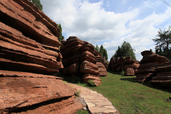 大約在四億八千萬(wàn)年前的早奧陶時(shí)期,紅石林地域?qū)俚厥飞纤Q的揚(yáng)子古海。海底沉積了大量混合泥沙的碳酸鹽物質(zhì),經(jīng)過地殼運(yùn)動(dòng)海底被抬起,在大自然風(fēng)化、水蝕、溶蝕和重力的外動(dòng)力地質(zhì)作用下,形成了這片美麗的地質(zhì)奇觀——中國(guó)唯一的紅色炭酸鹽巖石林。由于巖石物質(zhì)成分的差異,石牙芽、石林、有多種多樣的顏色。含鐵質(zhì)較多的,經(jīng)氧化后形成紅色;含泥質(zhì)較多的,一般呈灰色、灰綠色;含碳酸鹽較純的,一般呈白色。這樣形成的五彩石林,其中以紅色石林分布最廣,故為紅石林。