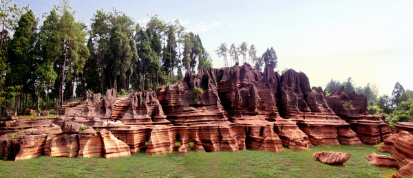 走近紅石林,您將感受到地質(zhì)遺跡的具象性和地域文化的民族性相融合的天、地、人之間的神秘文化。鳥瞰紅石林,地貌為五個(gè)臺(tái)地,中低外高成“V”字型向兩側(cè)擴(kuò)展。其中軸線,連貫1、2、3級(jí)常年積水的巖溶洼地。根據(jù)這一地質(zhì)遺跡的具象性,人們