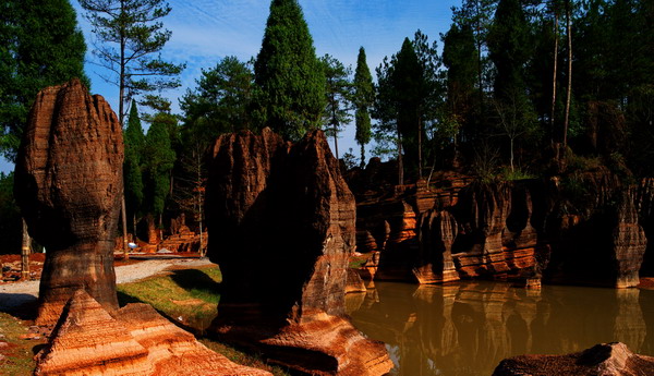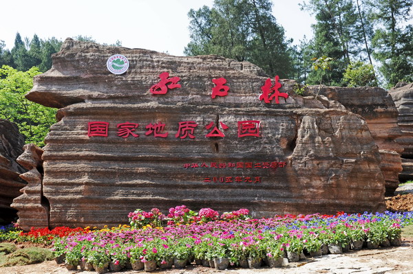 景區(qū)由紅色石林巖溶地貌和峽谷地貌以及暗河、湖泊、瀑布、洞穴地貌組成。它包括了石林、峰叢、石柱、河流、湖泊、暗河、瀑布、洞穴、巖溶洼地、標(biāo)準(zhǔn)地質(zhì)剖面和古生物化石等地質(zhì)遺跡組成。構(gòu)成了有的如神龜探海,鷹擊長(zhǎng)空,有的像紫荊花恕放,海洋冰床,有的像城堡峰,有的像乳燕待哺、蝸牛搬家,有的如七彩迷宮,有的如少女出浴、捧手祈福、觀音坐蓮,有的像石鞭候主、神龜探海,有的如神雕望月、錦雞鳴喜等形態(tài)多樣、色彩斑瀾、層次分明、美妙神奇、絢麗壯觀的地質(zhì)地貌景觀。